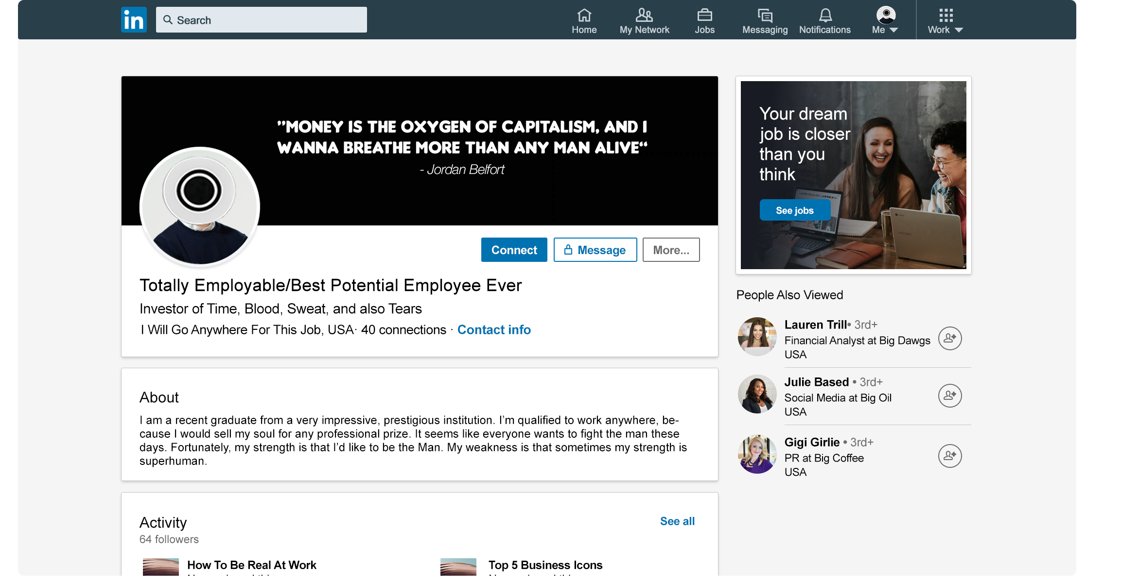 LinkedIn is a necessary evil for young professionals. It’s just another place where they can’t really express themselves. So, we’ll indulge in the mockery of it all for them.